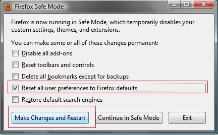 2. Now on the windows that pops up select “Reset all user preferences to Firefox defaults” and click on makes changes and restart. (See screenshot below)
